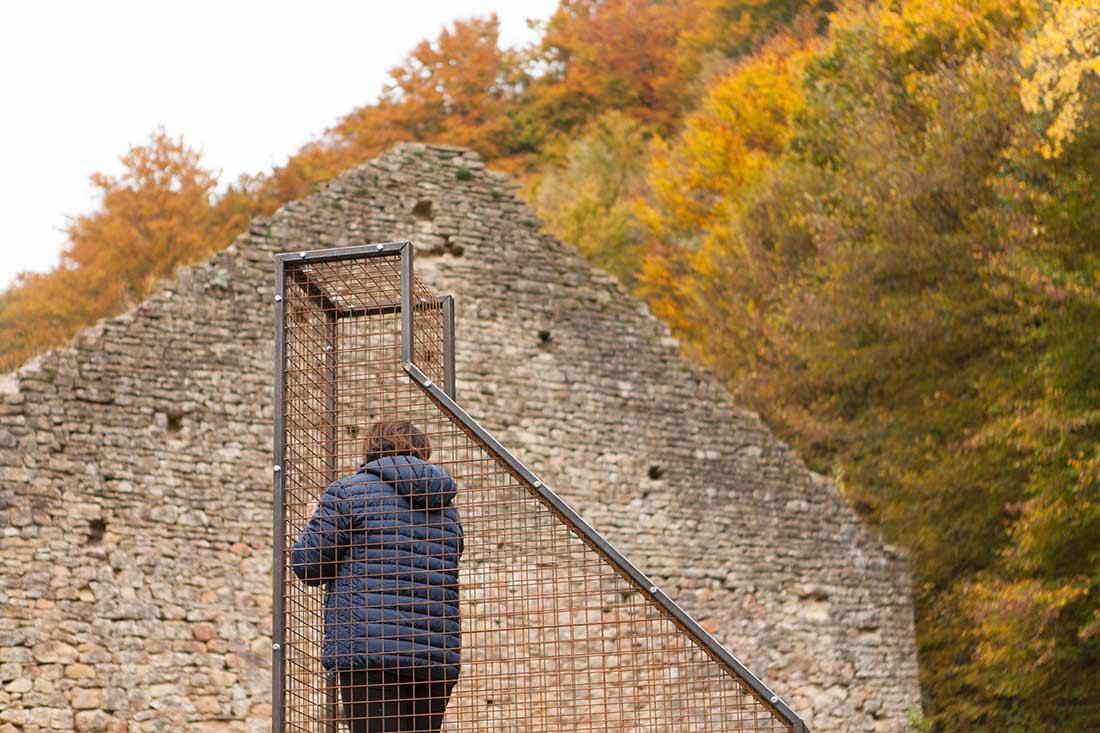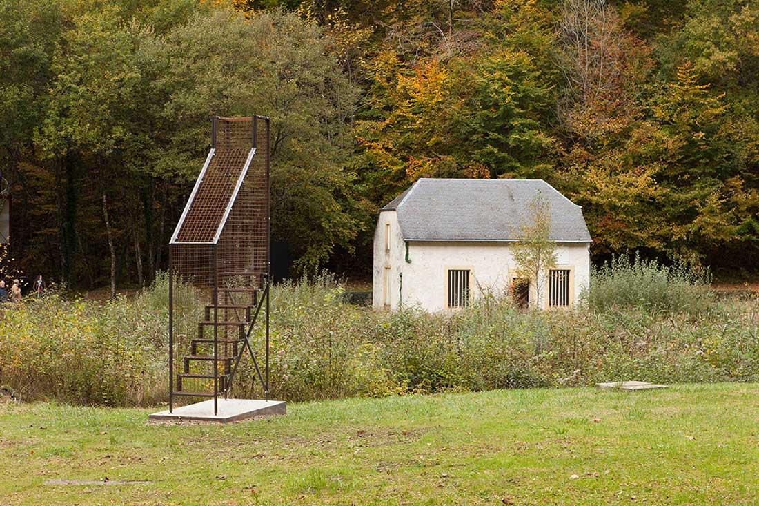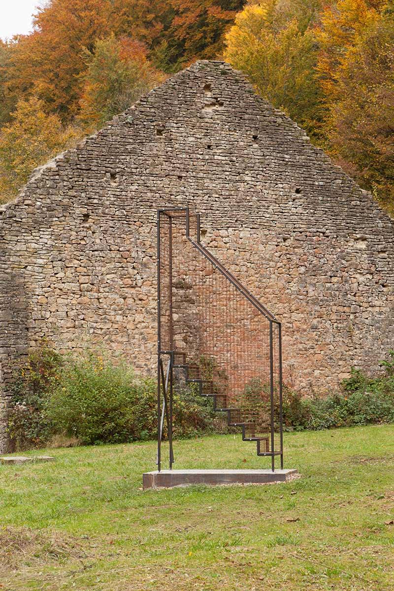 L‘oeuvre État IX, 2023 (Condition IX) joue avec l‘élément architectural de l‘escalier et explore un état physique et psychique. Les escaliers (comme les couloirs) sont des lieux de passage qui relient une zone à une autre. En privant l‘escalier de cet aspect, c‘est son propre effet en tant qu‘espace qui est examiné. Sa fin abrupte donne un tour ironique à la lecture de l‘escalier comme symbole de développement positif. Les murs de cette installation ressemblent à une cage, un élément que l‘on retrouve à plusieurs reprises dans le travail de Schönweger. Les visiteurs sont invités à entrer dans l‘oeuvre pour s’imprégner des impressions immédiates suscitées par celle-ci.