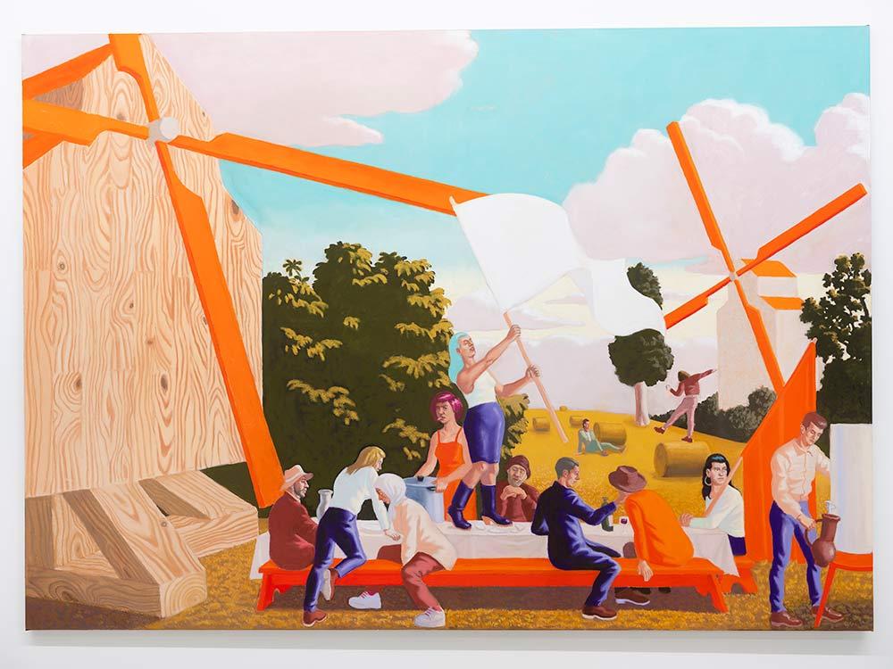 Emmanuel Tête, 'La fête au moulin', 2025. Gouache acrylique et pastels sur toile, 212 x 150 cm © photo : Jean-Pierre Ruelle