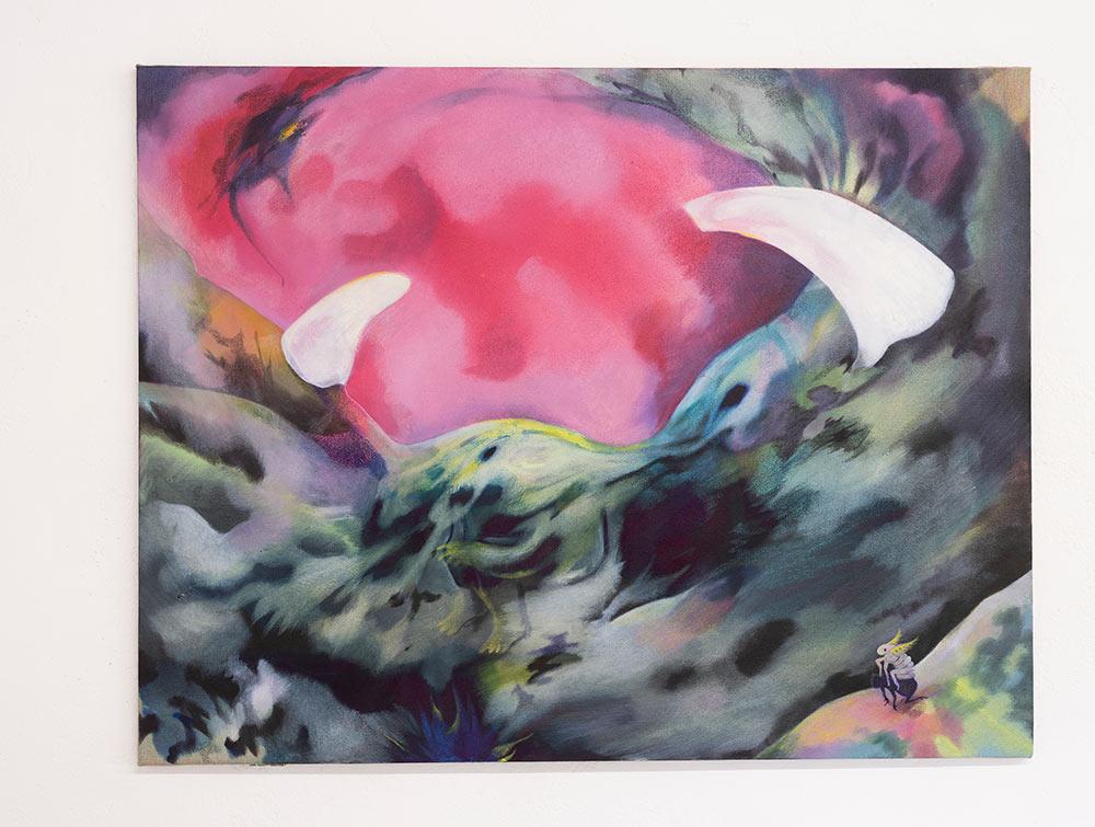 Olivia Perce, 'She had become tied to the metabolism of other lives, and until they rose, she could not rise either', 2025. Huile et pastels sur toile, 90 x 68 x 1 cm © photo : Jean-Pierre Ruelle